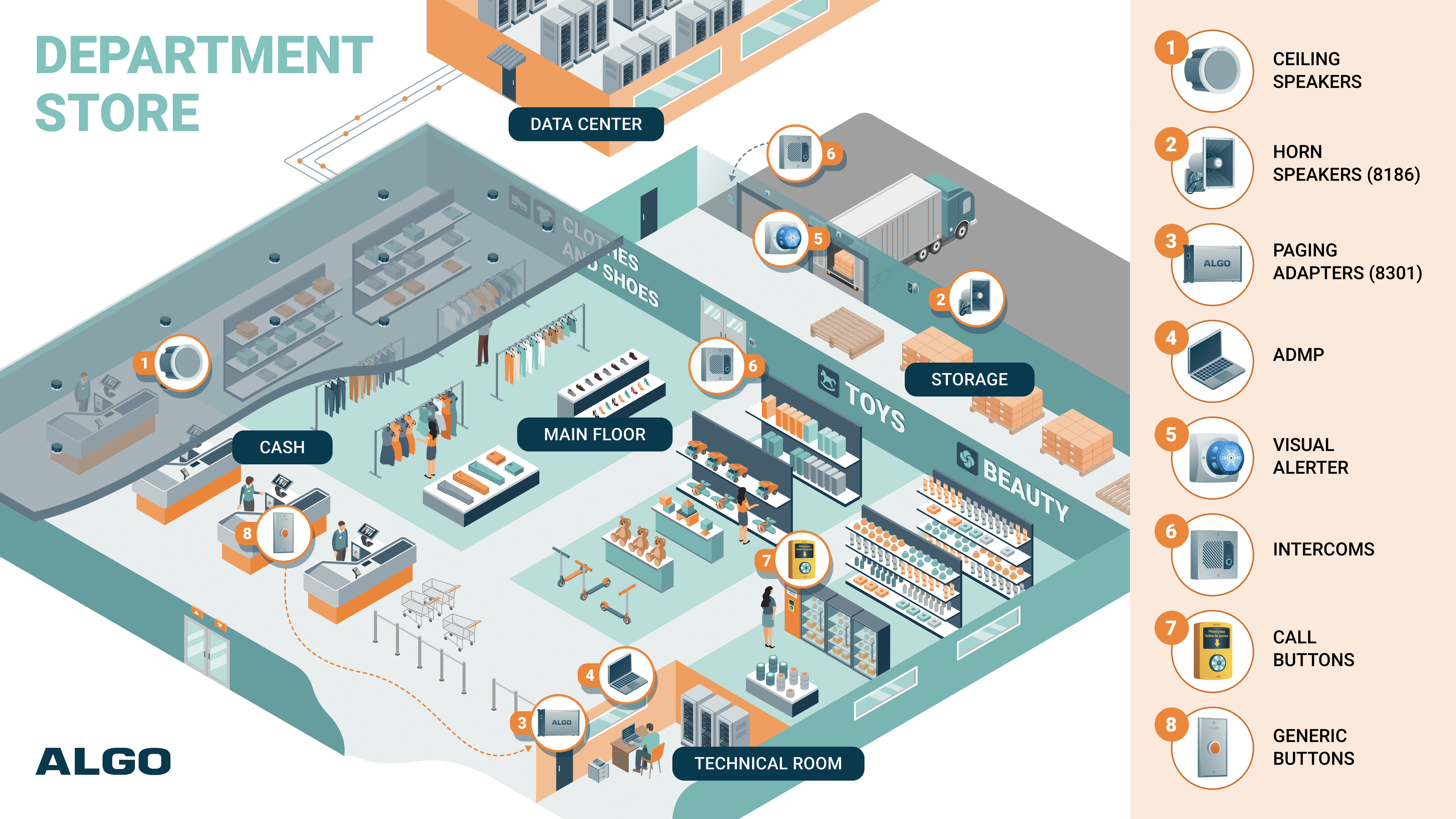 The task was to illustrate how Algo products can be placed in schools, hospitals, and warehouses to facilitate building communications for emergency situations or daily needs. Customers deploy Algo speakers, alerters, and displays for a clear and concise mass notification system. Using Algo’s IP endpoints for emergency alerts, daily announcements, news, clock displays, and messages.